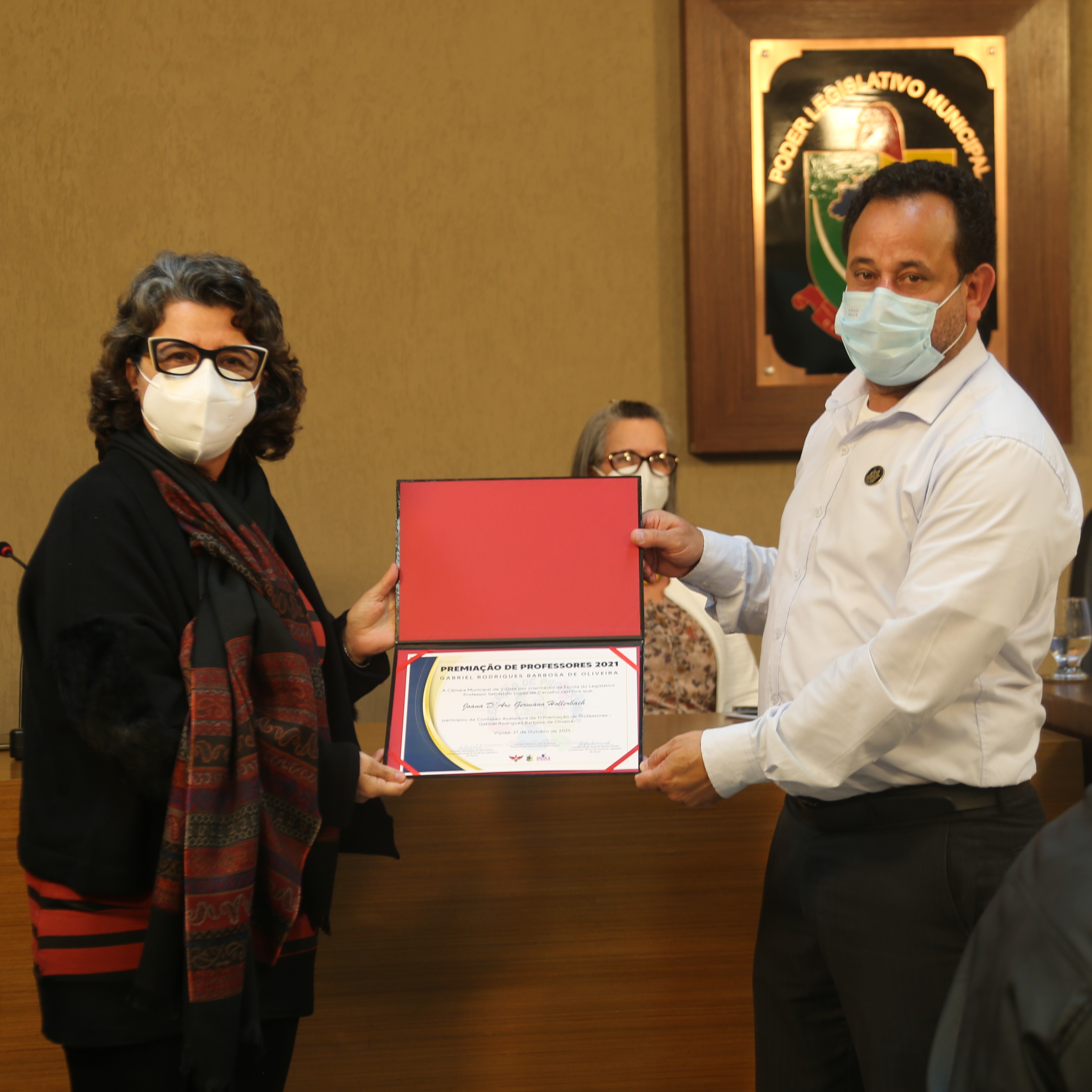 O Vereador Gilberto Brandão (Avante) entrega certificado à avaliadora, Joana D’arc Germano, professora do Departamento de Educação da Universidade Federal de Viçosa (UFV)