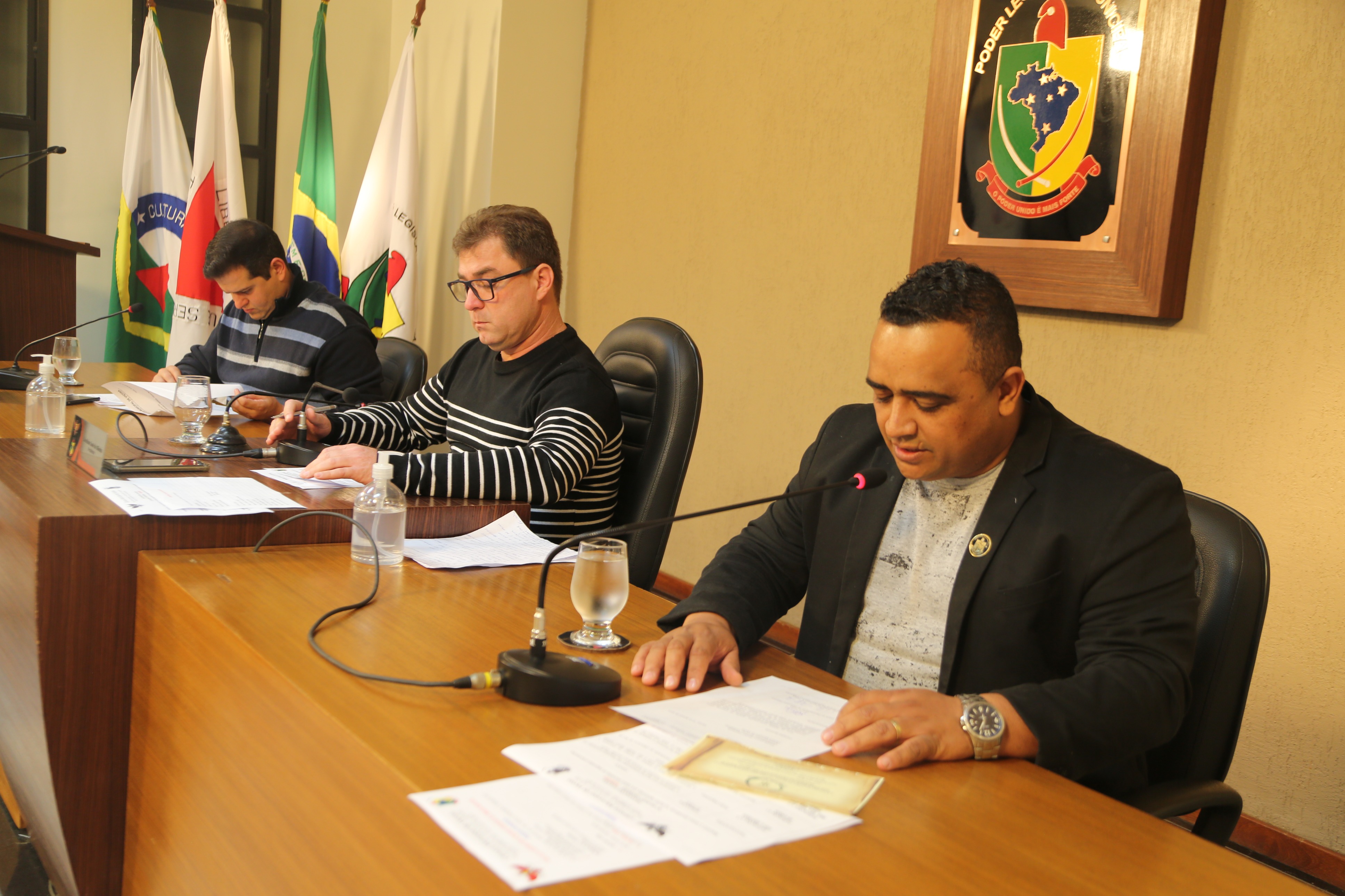 Mesa Diretora composta pelo Vice-Presidente, Vereador Rafael Cassimiro (PSDB), pelo Presidente, Vereador Edenilson Oliveira (PSD) e pelo Secretário em exercício, Robson Souza (Cidadania).