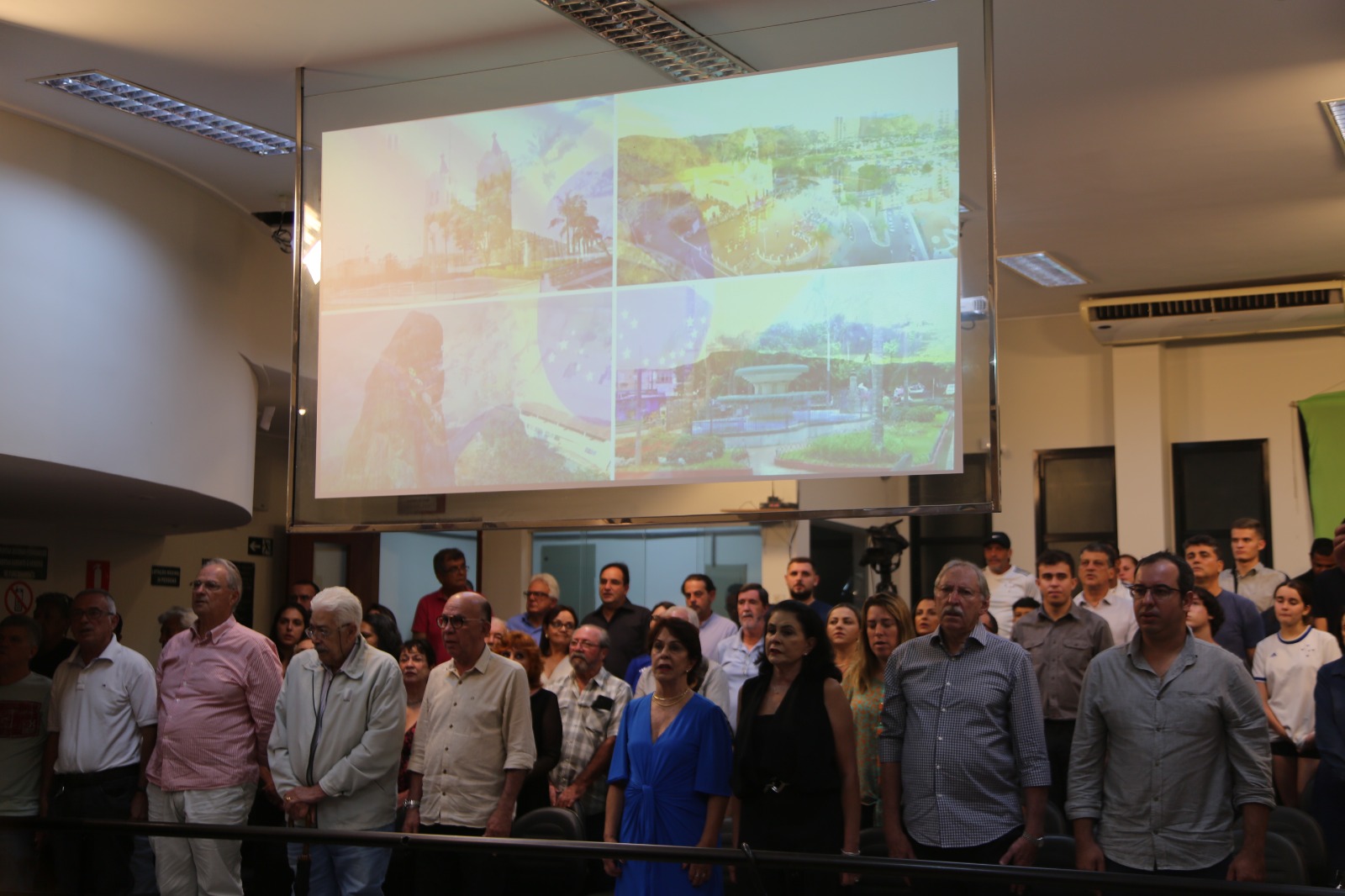 Momento do Hino Nacional com todos em posição de respeito