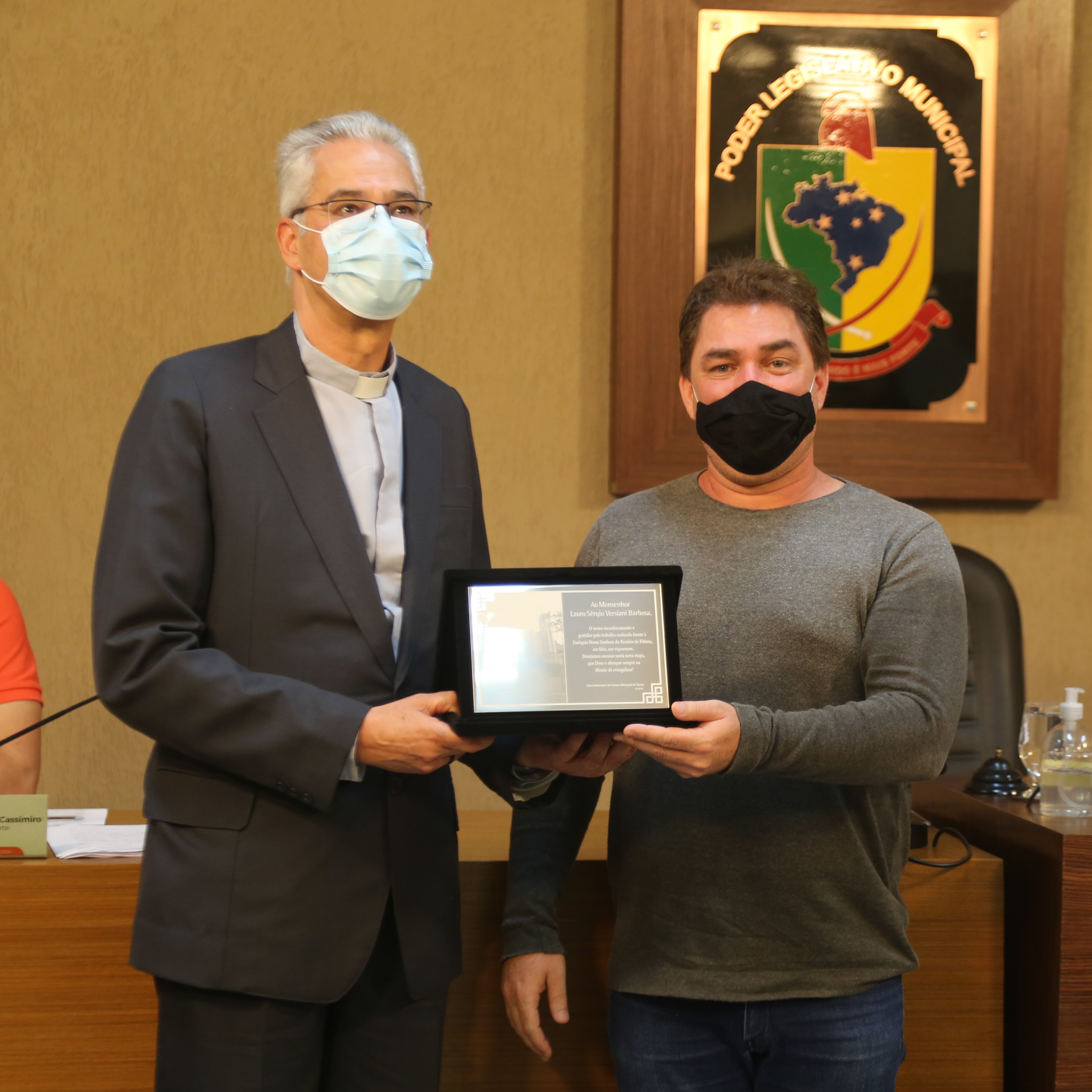 Homenagem ao Monsenhor Lauro Sérgio Versiani Barbosa com entrega de placa alusiva solicitada pelo Requerimento n° 064/2021, de autoria do Presidente da Casa, Vereador Edenilson Oliveira (PSD) com assinatura dos Vereadores Bartomélio Martins (Professor Barto) (PT), Jamille Gomes (PT), Marly Januário (PSC) e Robson Souza (Cidadania)